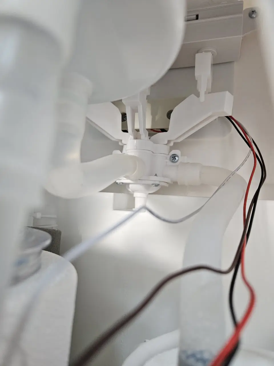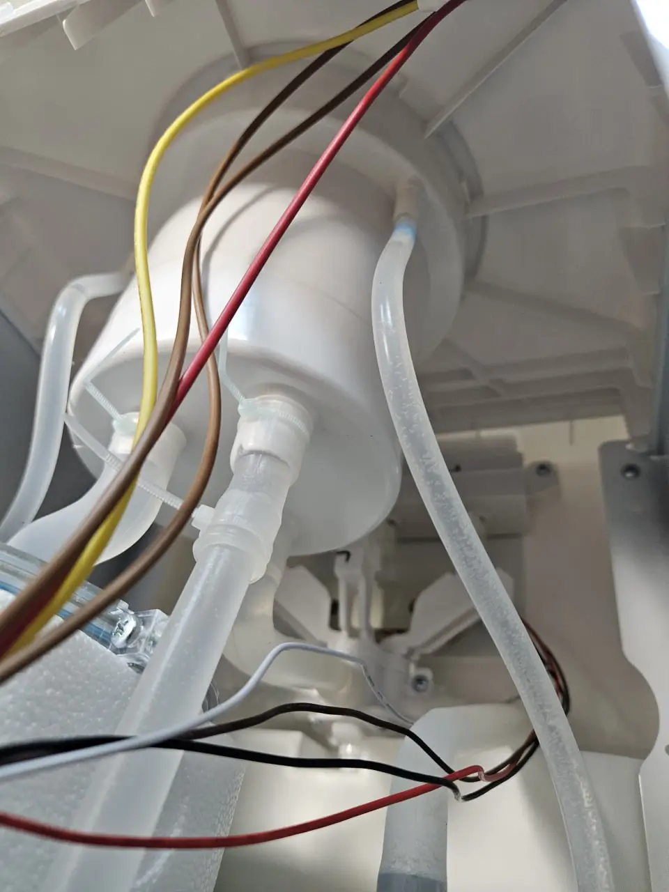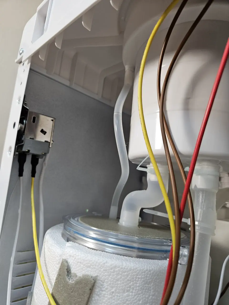 Также разобрали кулер изнутри и показали крупным планом, из чего он состоит, все детали, качество сборки, какие баки, резервуары, датчики, механизм крана, компрессор, термостат, а также как соединены между собой силиконовые трубки между баками с кранами и сливными отверстиями.