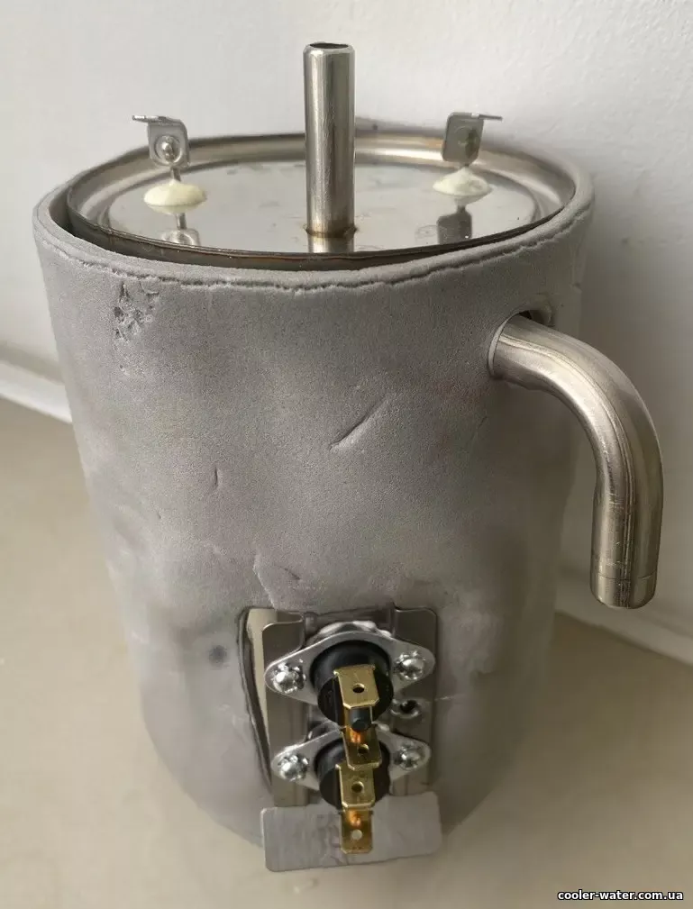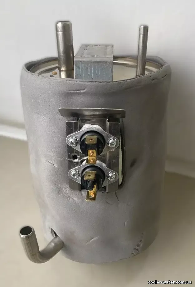 В боковой части бачка так же идут клеммы для ТЭНа. Бак ориентировочно до литра в объёме, поставляется без датчиков вкл-выкл гор воды. И без обшивки его, то есть голый бак, всё остальнео ваше со старого кулера, датчики, трубки, шуба(утеплитель). Трубки также в комплект не входят, приобретается всё отдельно или используете ваши старые. В наличии у нас всё есть так же к кулерам Вио.