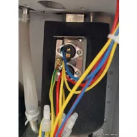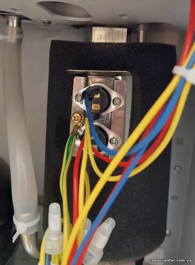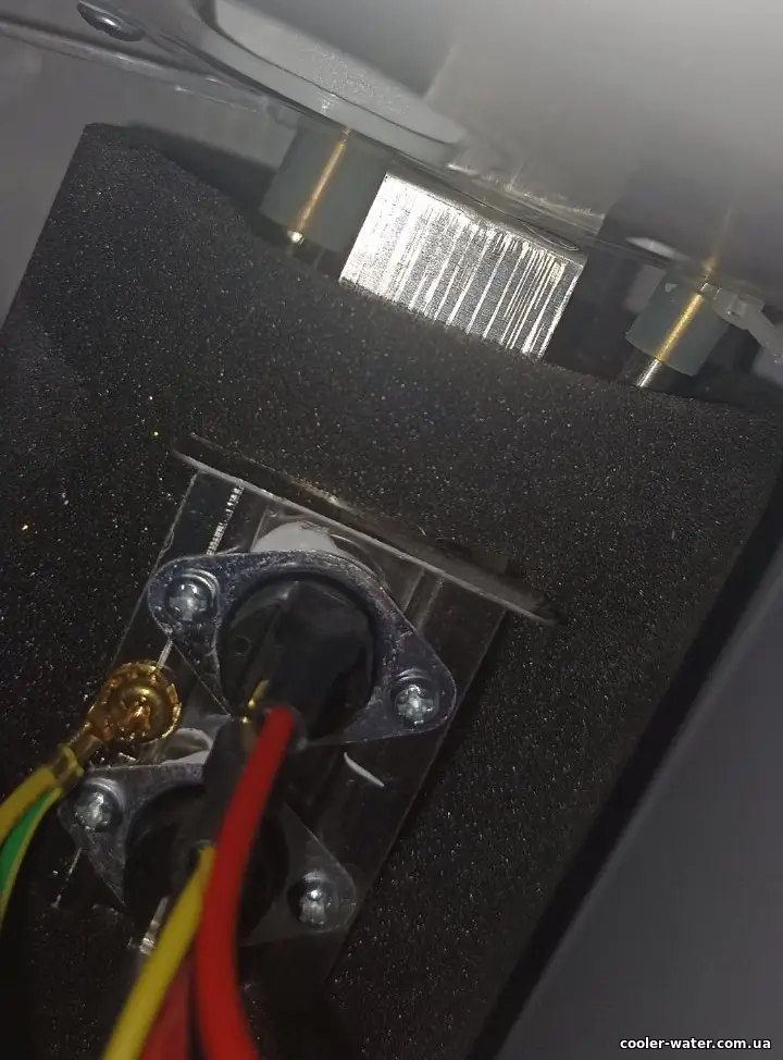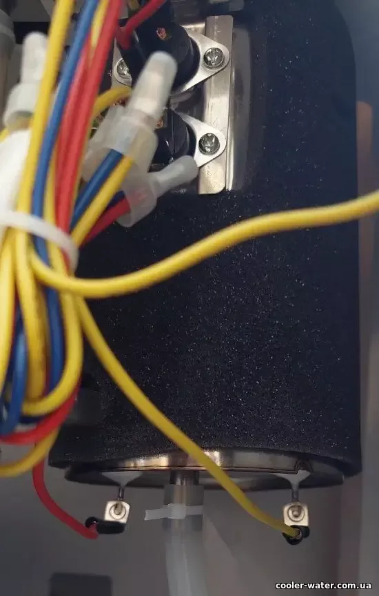 Верхнее крепление, 2 трубки сверху на выход воды с бака в краник гор воды(маталл.) и выход пара(силикон). Сбоку трубка - вход воды с бутыли по трубке в мини-бойлер. Снизу прямо выход воды с бака через сливной клапана, для опустошения кулера полностью, в случае необходимости.