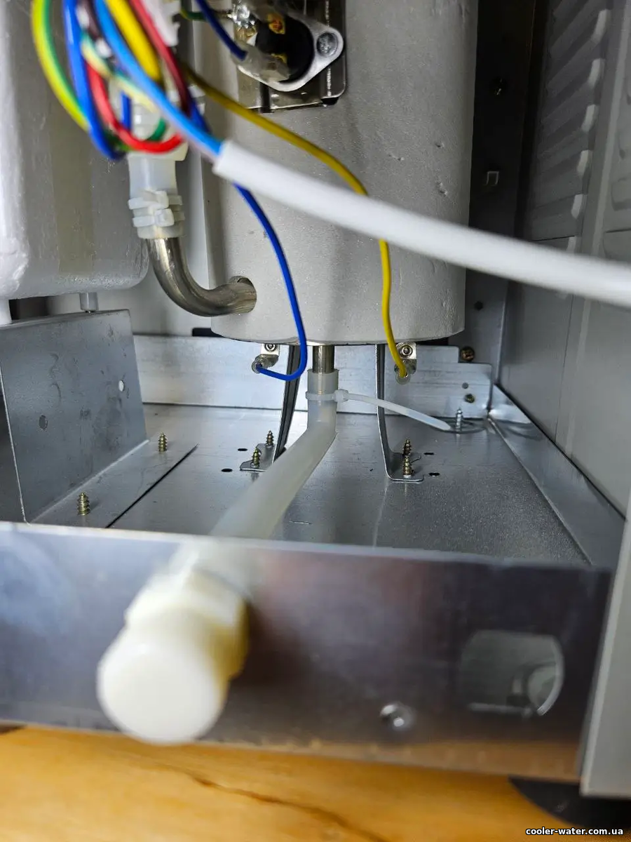 Нижнее крепление на ножках, 2 трубки сверху на выход воды с бака в краник гор воды и выход пара. Сбоку трубка - вход воды с бутыли по трубке в сам бачок нагрева. Снизу прямо выход воды с бака горячей воды через сливной клапана, для опустошения кулера полностью, в случае необходимости. В нижней части бачка так же идут клеммы для ТЭНа. Бак ориентировочно до литра в объёме, поставляется с термодатчиками вкл-выкл гор воды. Трубки в комплект не входят, приобретается всё отдельно или используете ваши старые. Не разборной и имеет внутри ТЭН нагрева 500вт.