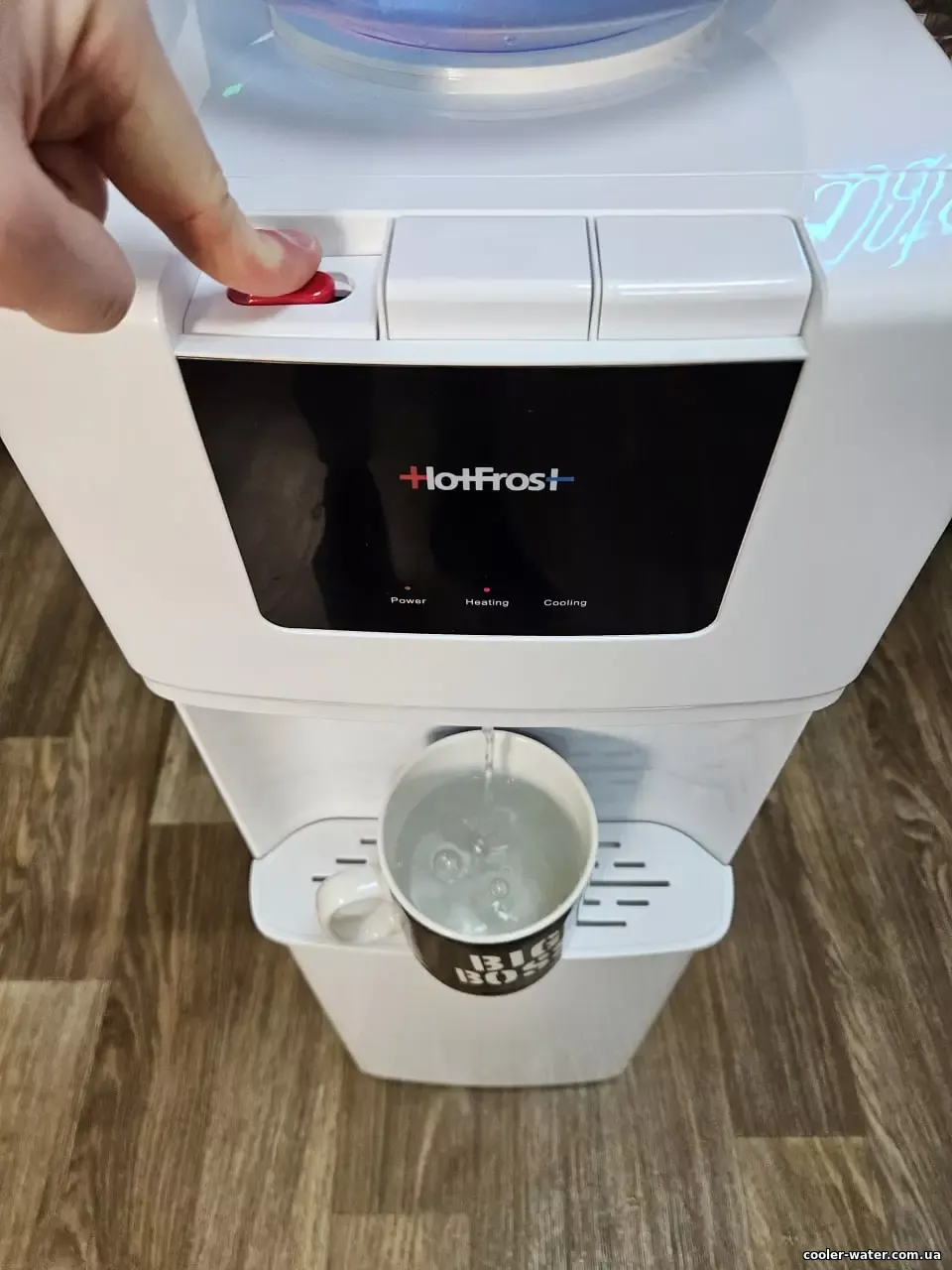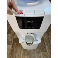 - Кулер для воды Хотфрост 8020 оснащен тремя кранами по типу кнопками, которые очень просты в использовании. Вам достаточно нажать рукой и держать столько, сколько нужно что бы текла вода из краника. Краник горячей воды имеет защиту от детей (ползунок в сторону двигать).