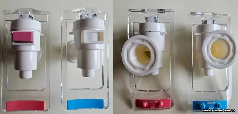 Краны на горячую(красный) и холодную(синий) воду для кулеров , точно подходит на бренды Clover LB-LWB 1.5-5x77, Clover LB-LWB 1,5-5X77 POU с внутренней резьбой или "мама". Нажим кружкой Стоимость краника указана за комплект 2шт.