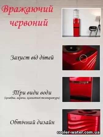 - Кулер станет прекрасным выбором как для дома, так и для офисного помещения или использования в заведениях общественного питания. Симпатичный дизайн прямоугольной формы выполнен в красном цвете, который легко впишется в ваш интерьер. Имеет индикатор на нагрев воды, который светится красным, когда кулер нагревает воду, и зеленым - когда охлаждает.