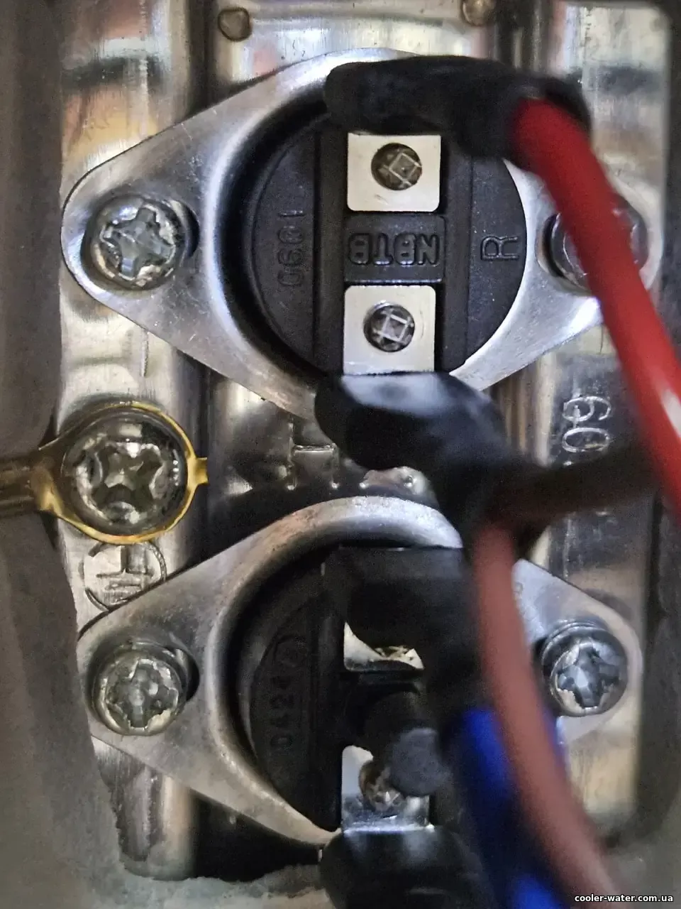 Биметаллический датчик температуры, универсальные комплект термодатчиков кулера воды на все модели кулеров напольыне и настольные, всех брендов и производителей от Китая до Кореи. Верхний датчичк включения и выключения при нагерве 95 градусов. Нижний датчик с кнопкой, защитный, овтечает за аварийное выключение если вы включите кулер без воды, или если выйдет верхний датчик из строя и не выключит нагерв во время своего пика температуры в 92-95 градусов. В таком случае на помощь приходит нижний датчик и выключает полностью нагрев, до тех пор пока не исправите причину срабатывания защиты(вода или датчик). И после этого нажать один раз на эту кнопку маленькую. В комплекте поставляется 2 шт. которые подходят для всех металлчиеских бачков нагревательных в кулерах водных. Установка происходит с помощью термопасты и двух маленьких шурупчиков. После этого запитываете проводами. Видео инструкция будет снизу.